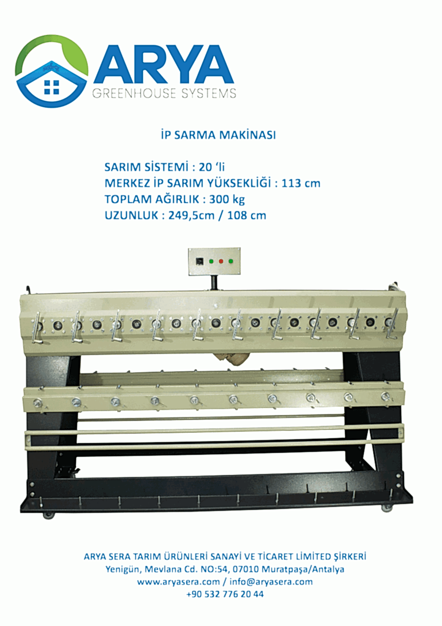 Tam otomatik sera iplik sarma makinası sera içerisinde bulunan askı telleri üzerine hızlı ve düzenli bir şekilde iplik sarmaya yarayan 20 kafalı olarak yapılan otomatik zamanlayıcı ile ip metrajını ayarlayabildiğiniz sera yardımcı aracıdır. Sera ip sarma makinası 180 mm ve 220 mm tellere göre değişken aparat yapısına sahip olup isteğe göre imal edilmektedir. Aparatlarda tellerin rahat sökülüp takılabilmesini sağlayan yay tansiyonlu rulmanlar kullanılmaktadır.